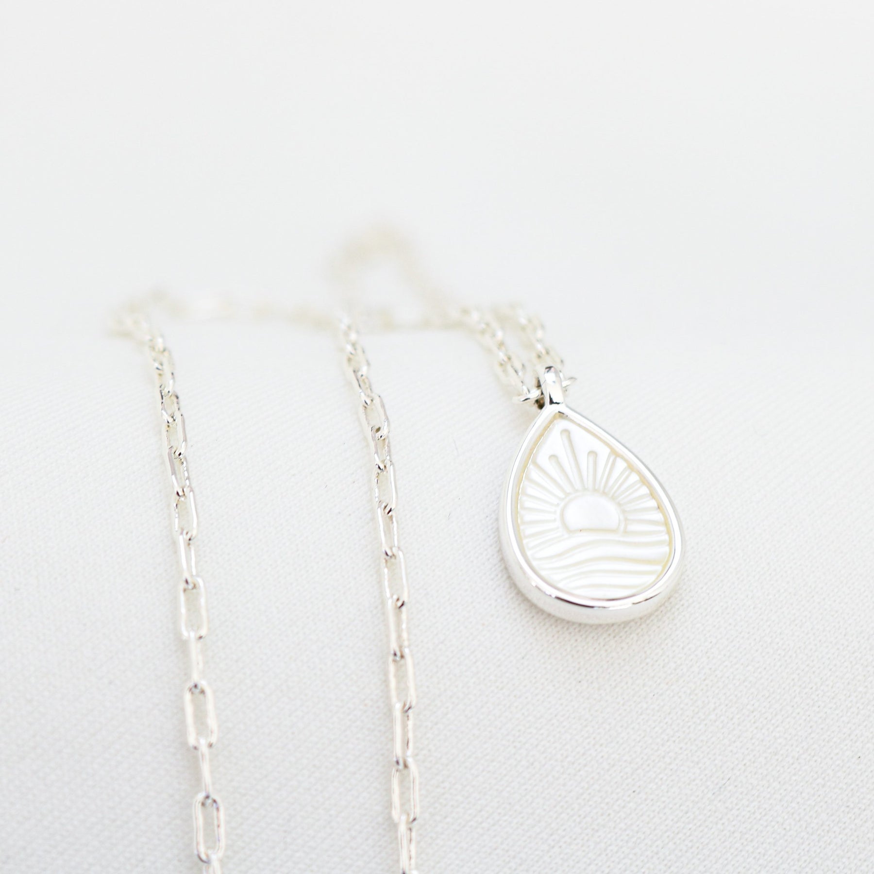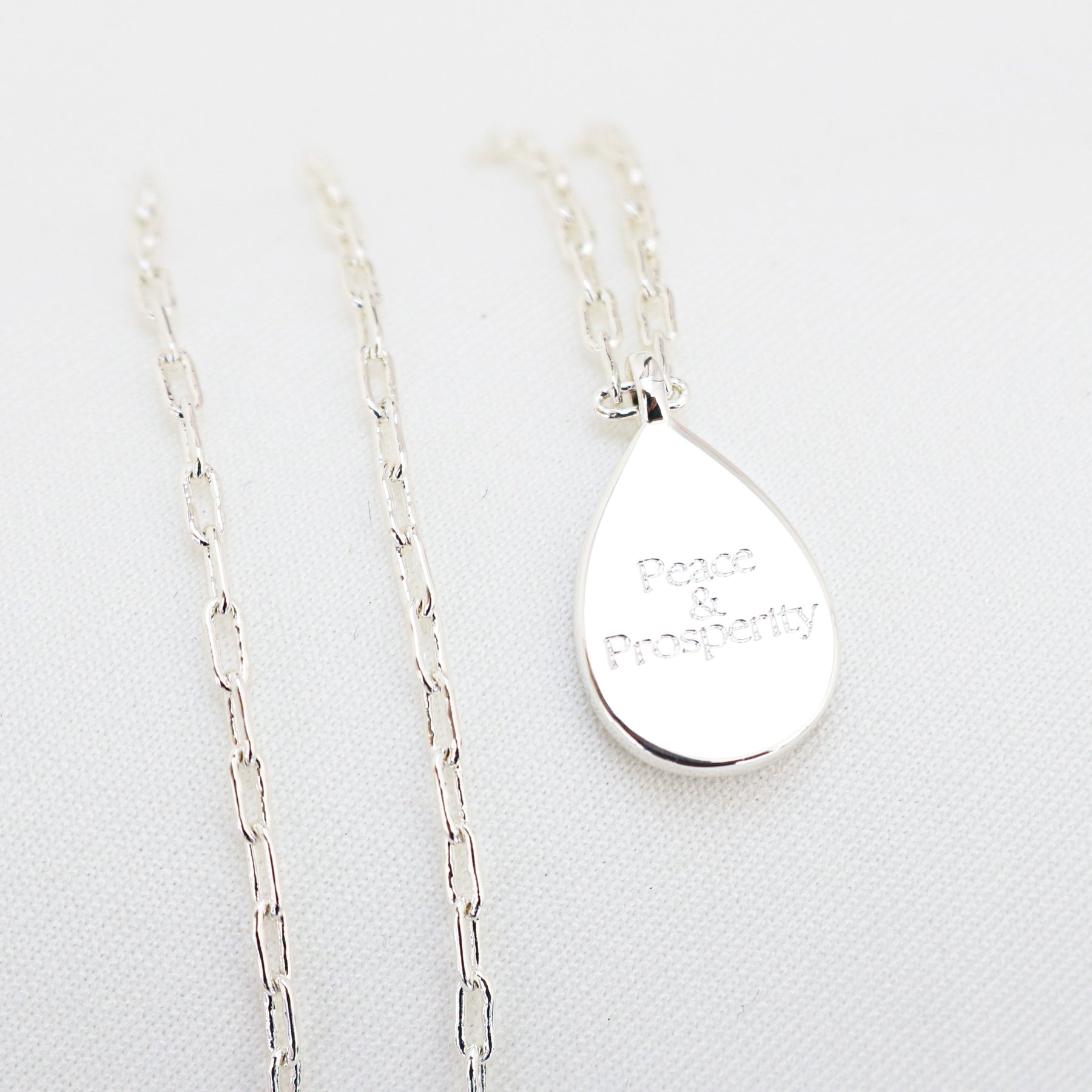 The Kailani Necklace is a gentle expression of peace, prosperity and protection. On the Mother Of Pearl teardrop pendant, you’ll find our delicate ode to Sea and Sky etching. Kailani represents the boundless beauty of Mother Nature. Turn the pendant over, and you’ll find a hidden message: Peace and Prosperity, your daily affirmation and worn close to the heart. She is a keepsake of calm, soothing the spirit in the ever-moving tides of life.