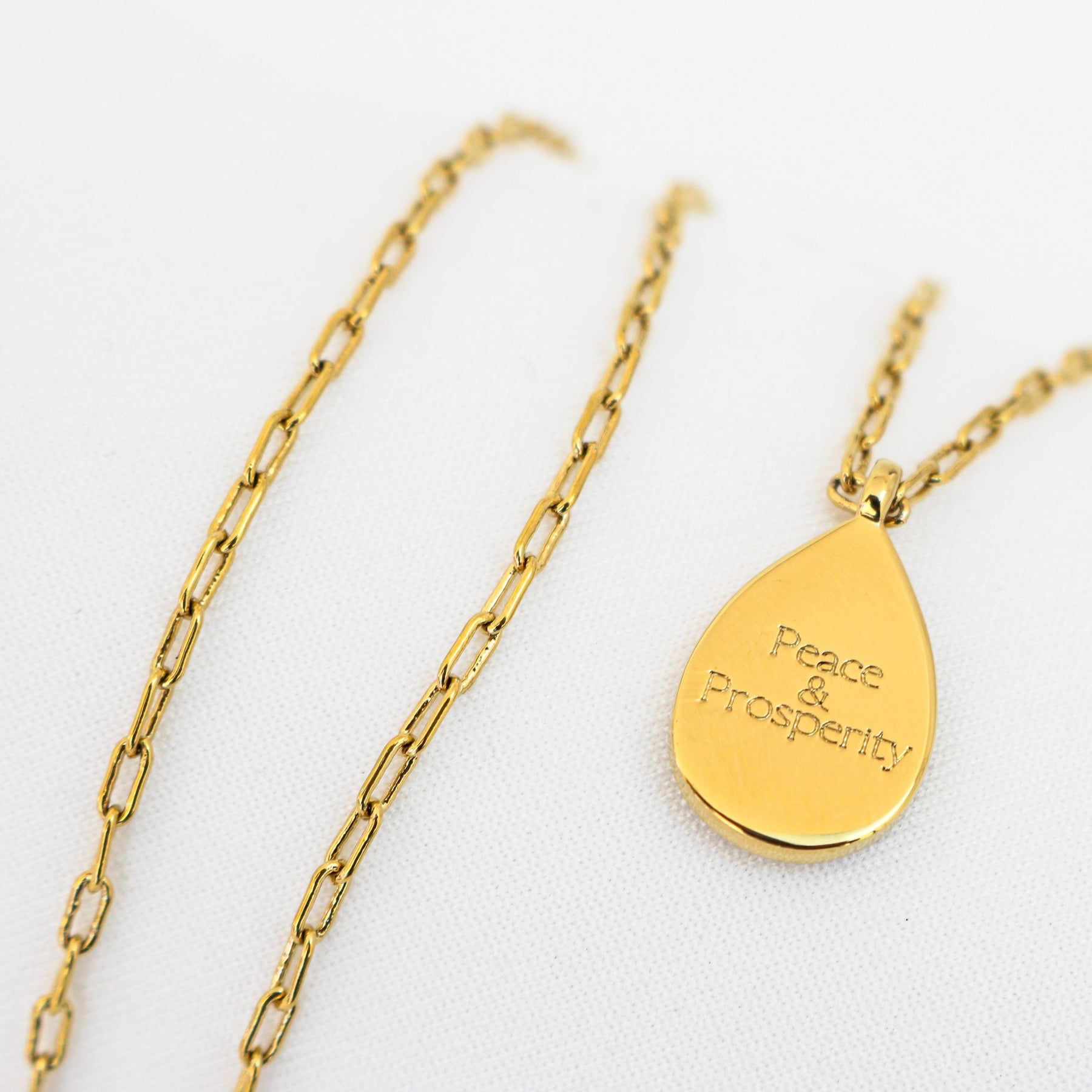 The Kailani Necklace is a gentle expression of peace, prosperity and protection. On the Mother Of Pearl teardrop pendant, you’ll find our delicate ode to Sea and Sky etching. Kailani represents the boundless beauty of Mother Nature. Turn the pendant over, and you’ll find a hidden message: Peace and Prosperity, your daily affirmation and worn close to the heart. She is a keepsake of calm, soothing the spirit in the ever-moving tides of life.