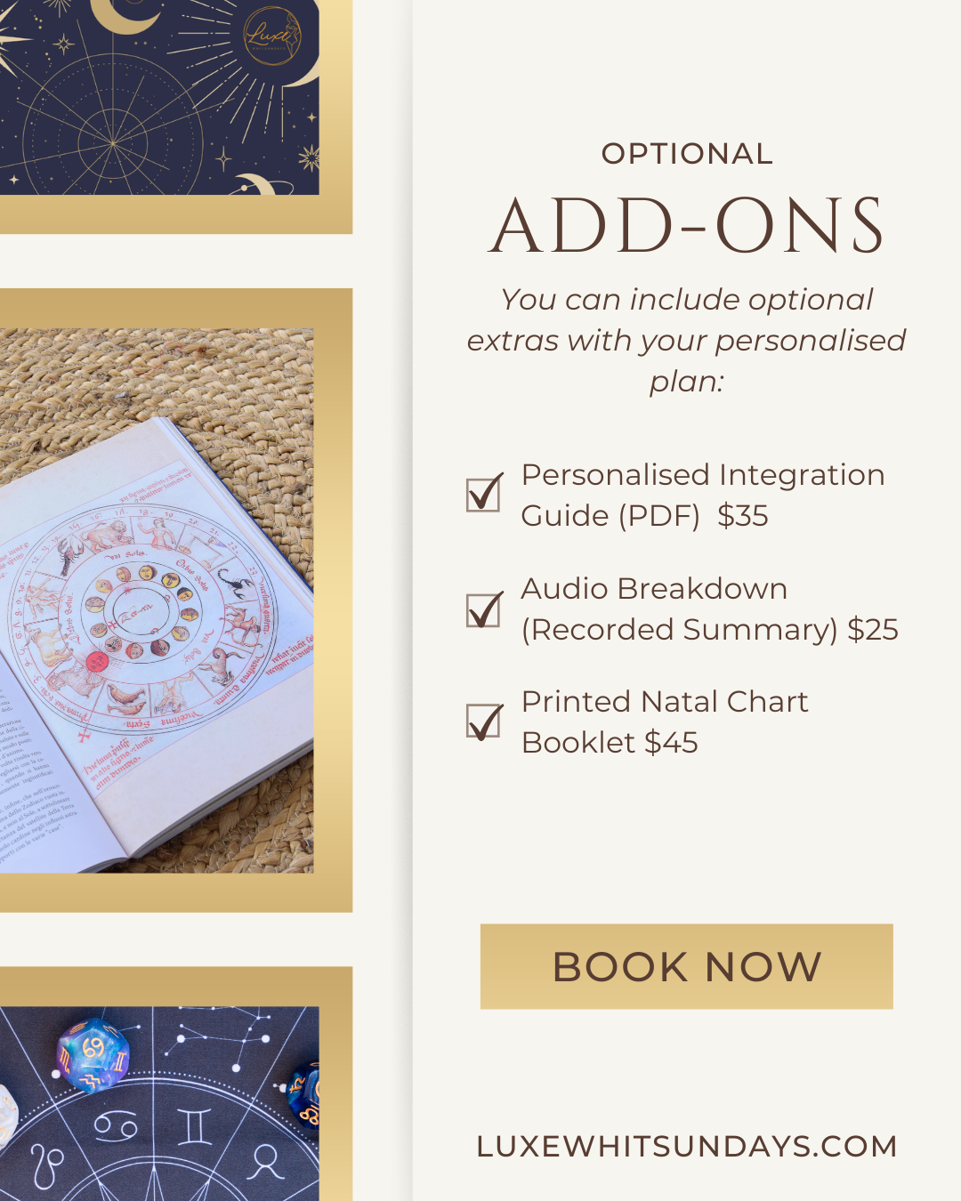 Personalised Integration Guide (PDF) $35 | Add-on to any reading: A beautifully designed, personalised guide to help you integrate your natal chart insights into everyday life.